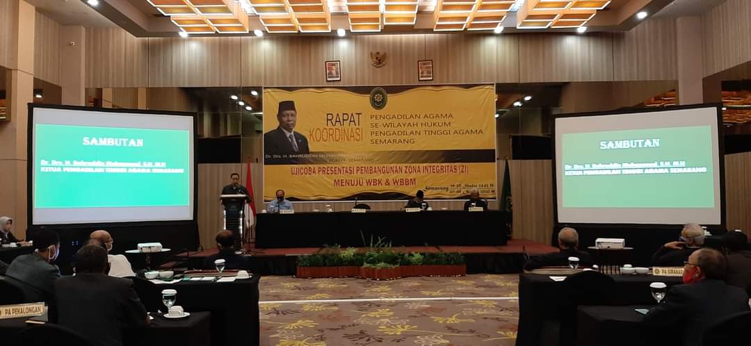 Rabu, 07 September 2020, Ketua Pengadilan Agama Banyumas Dra. Hj. Suhaimi, M.H. menghadiri acara Rapat Koordinasi dan Uji Coba Presentasi Pembangunan Zona Integritas (ZI) Pengadilan Agama di Wilayah Hukum Pengadilan Tinggi Agama Semarang. Sesuai dengan surat Ketua Pegadilan Tinggi Agama Semarang Nomor: W11-A/3178/HM.01.1/2020 tanggal 5 Oktober 2020, acara Rapat Koordinasi dan Uji Coba Presentasi ZI berlangsug selama 2 (dua) hari dan masing-masing Ketua Pegadilan Agama didampingi oleh Operator ZI.